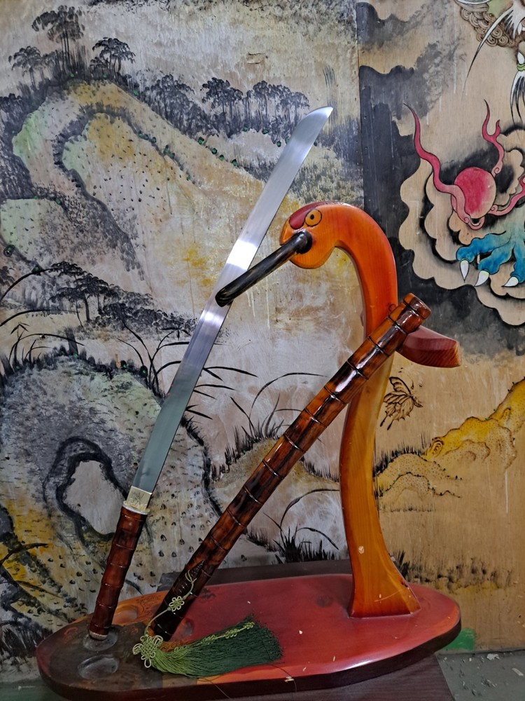 대나무 모양으로 만든 삼각도입니다. 짚단베기 전용으로써 베기가끝내줍니다.. 모양또한 심플하고 깔끔합니다. 칼날에 문양과 이름조각도 가능합니다. 전화로 문의주세요. 032) 501-3035